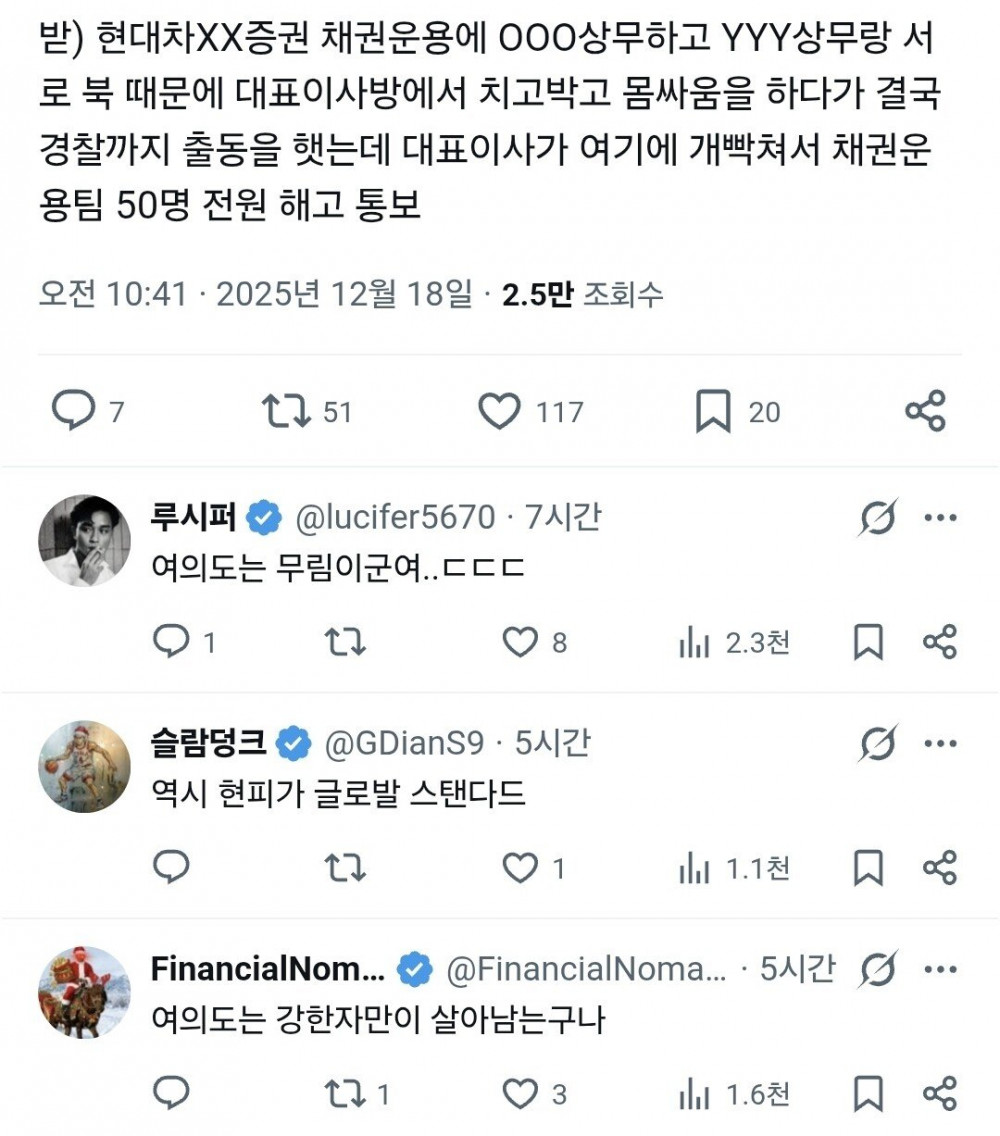 https://m.ddaily.co.kr/page/view/2025121817101305812 현대차증권이 자사 채권사업부를 절반으로 대폭 축소하는 조직 개편을 단행한 것으로 확인되면서 다양한 억측을 낳았다. 논란이 커지자 현대차증권은 "업무 효율화를 위한 결정"이라는 입장을 내놨다.