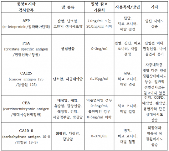 종양표지자검사로 활용되고 있는 것은 암세포가 증식돼 있는 조직 내에서 나오는 물질로 대표적 종양표지자에는 ‘AFP’, ‘PSA’, ‘CA125’, ‘CEA’, ‘CA19-9’ 등이 있다.