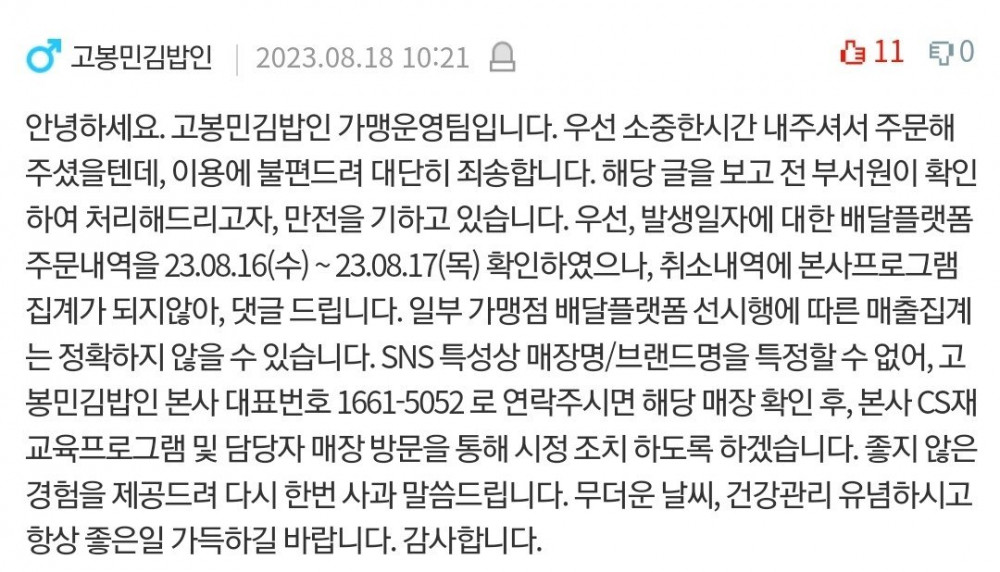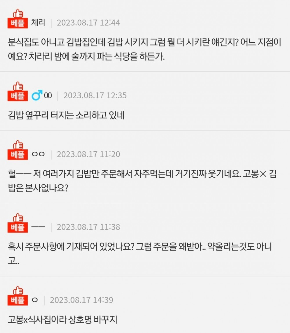 현재시각 1시간 전 고봉민 김밥 댓글 등판