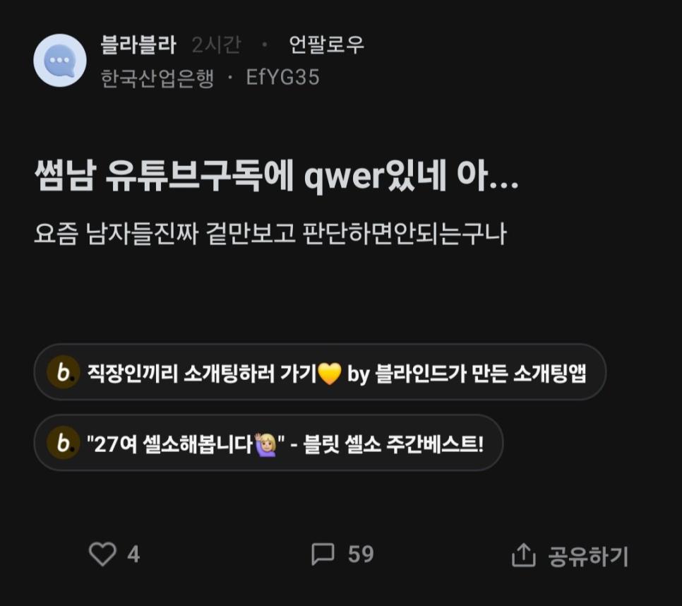 썸남 유튜브 구독에 qwer 있네 아....blind