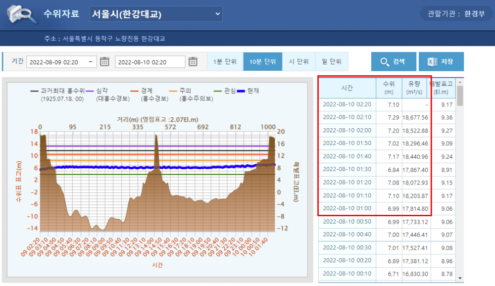 인근에 있는 한강대교에서 관측한 수위와 유량