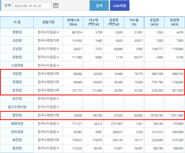 오전 2시 20분의 한강 상류의 댐 방수량 근황