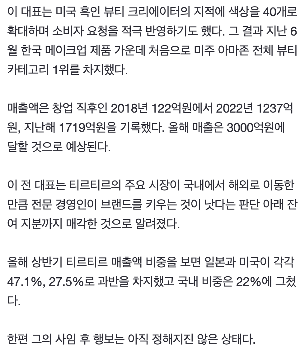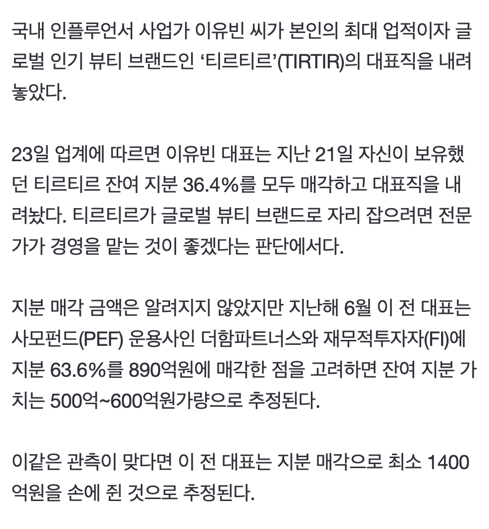 이유빈, 티르티르 지분 매각->1400억 대박