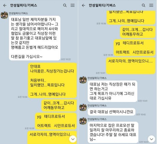 당초 전 대표는 더기버스 안성일 프로듀서의 ‘레이블 딜’ 제안에 대해, 회사를 팔지 않고 선급금 투자 방식으로 진행하며 "직상장가는 것이 나의 목표이자 명예"라는 입장을 분명히 했다. 이는 두 사람이 지난 4월22일 주고받은 문자메시지(사진1)를 통해서도 확인된다.
