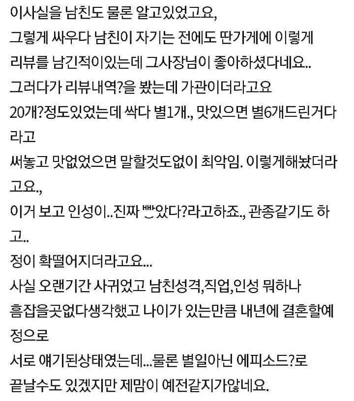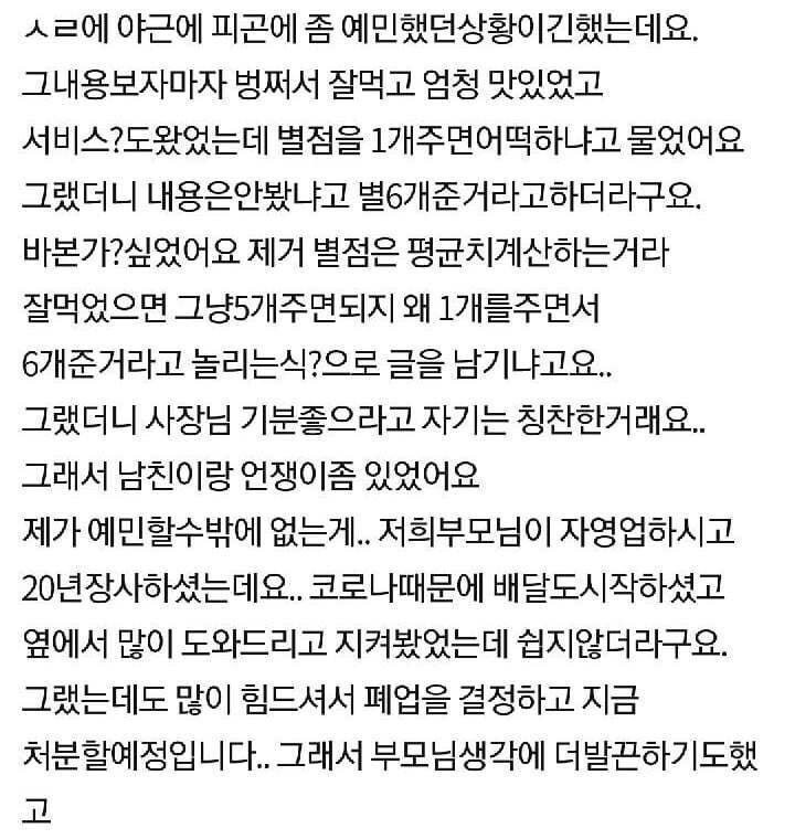 1. 남친이 별점 6점이라면서 상습적으로 배달앱 별점을 1점 테러하는걸 여친이 목격