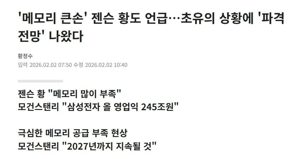 JP모건 “코스피 전망 6000 넘어 7500” [투자360] - 헤럴드경제 메모리 큰손 젠슨 황도 언급…초유의 상황에 파격 전망 나왔다 | 한국경제